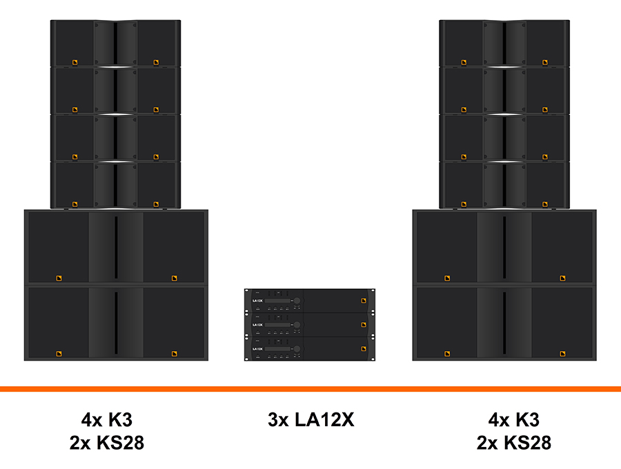 Deze grote L-Acoustics K3 geluidset is een line-array die vanaf de grond wordt gestapeld. We spreken van een "ground stack". De set is geschikt voor een groot publiek zoals bij een festival.