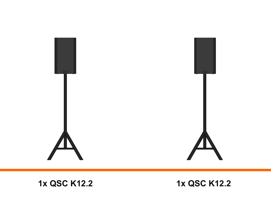 Deze self-powered QSC geluidset is een stereo set bestaande uit een QSC K12.2 speaker op statief.